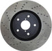 StopTech Drilled Sport Rotors are 1-piece direct replacement brake discs for factory brake systems and stock calipers that look great behind your wheels – and offer significantly improved braking performance. The unique cross-drilling aids with heat and brake dust dispersal; prevents glazing of the pads; adds bite and improves wet and dry braking performance. Built to last; the black e-coating provides protection from corrosion and the high carbon metallurgy (in most applications) offers quieter operation; better crack resistance and increased performance.
