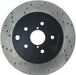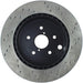 StopTech Drilled Sport Rotors are 1-piece direct replacement brake discs for factory brake systems and stock calipers that look great behind your wheels – and offer significantly improved braking performance. The unique cross-drilling aids with heat and brake dust dispersal; prevents glazing of the pads; adds bite and improves wet and dry braking performance. Built to last; the black e-coating provides protection from corrosion and the high carbon metallurgy (in most applications) offers quieter operation; better crack resistance and increased performance.