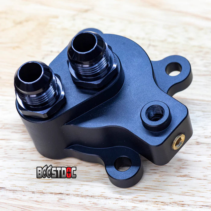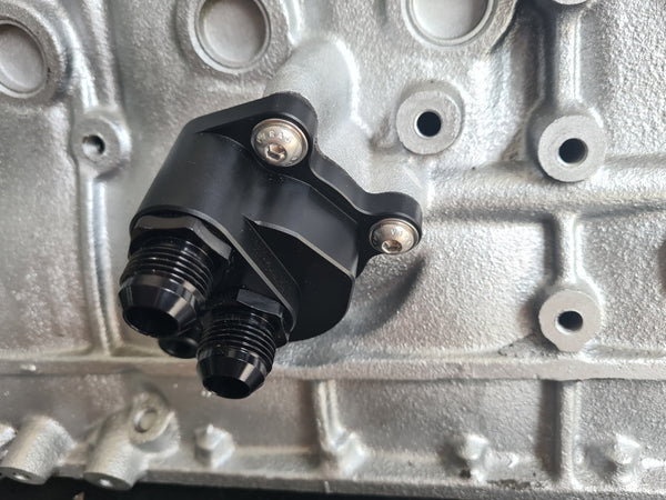 Made from aircraft grade 6061, the unit uses twin AN10 outlets and sits the hoses on top of each other to allow for a smooth hose installation in the engine bay.