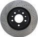 StopTech Drilled and Slotted Sport Rotors are 1-piece direct replacement brake discs for factory brake systems and stock calipers that look great behind your wheels – and offer significantly improved braking performance. The unique cross-drilling and slotting aids with heat and brake dust dispersal; prevents glazing of the pads; adds bite and improves wet and dry braking performance. Built to last; the black e-coating provides protection from corrosion and the high carbon metallurgy (in most applications) offers quieter operation; better crack resistance and increased performance.