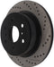 StopTech Drilled and Slotted Sport Rotors are 1-piece direct replacement brake discs for factory brake systems and stock calipers that look great behind your wheels – and offer significantly improved braking performance. The unique cross-drilling and slotting aids with heat and brake dust dispersal; prevents glazing of the pads; adds bite and improves wet and dry braking performance. Built to last; the black e-coating provides protection from corrosion and the high carbon metallurgy (in most applications) offers quieter operation; better crack resistance and increased performance.