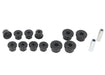 All in one leaf spring bushing service kit covering front and rear eyes of the leaf plus shackle bushings. High kilometres and heavy load carrying causes excessive wear on rubber bushings. Whiteline's signature black bushings are made tough and offer outstanding abrasion resistance, high load bearing capability (4WD's, utes and towing), flexibility, increased tensile strength and chemical resistance to oil, grease, ozone and weathering.
